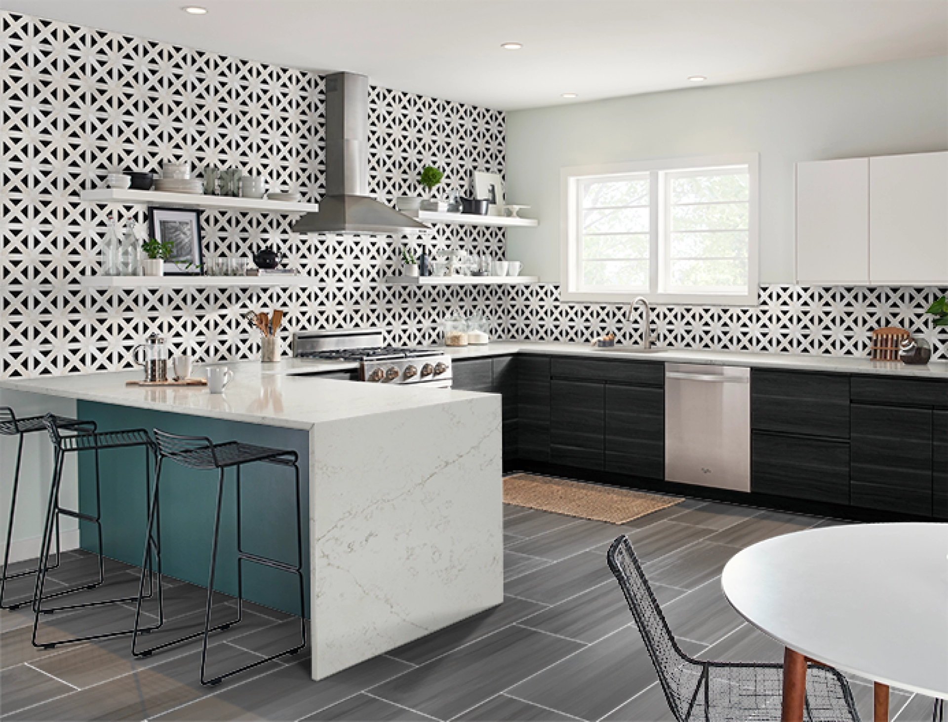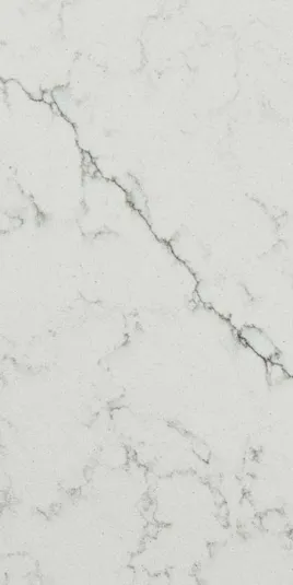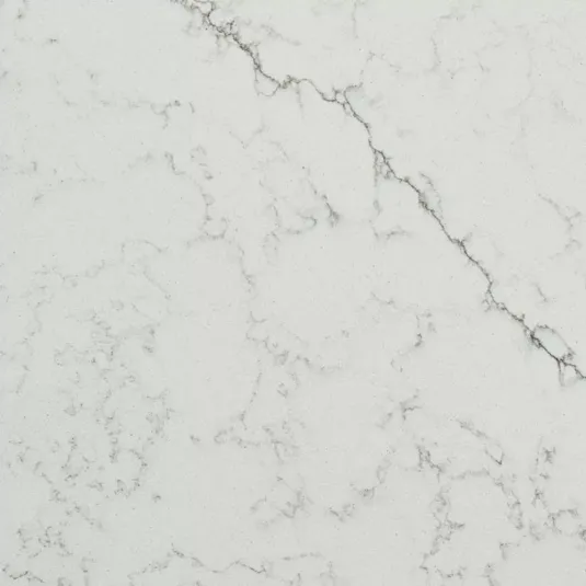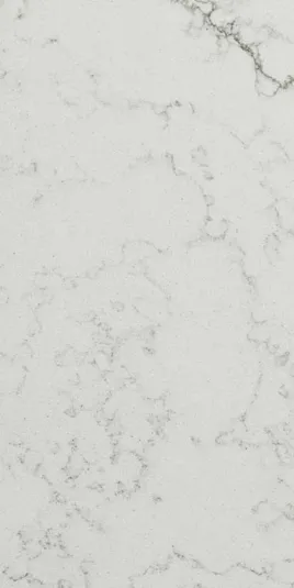 Alabaster Quartz is a polished marble-look quartz featuring a soft white background and long gray veins for unstoppable elegance.