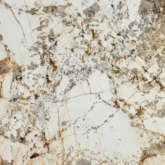 Granite Blanc Du Blanc is striking Brazilian granite that displays a blend of large clear crystals over blotches of cream white, with smaller flecks of black. This is accented by a rusty gold color that seeps into every crevice of the stone to bring warmth that is hard to mimic. Because of its varying chipped yet beautiful pattern, the stone is sure to fit in any setting.