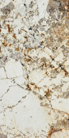 Zebra-like etchings and natural fissures in shades of taupe and rust spreading far and wide over a cream background; this is the unique pattern that’s characteristic of Blanc du Blanc granite.